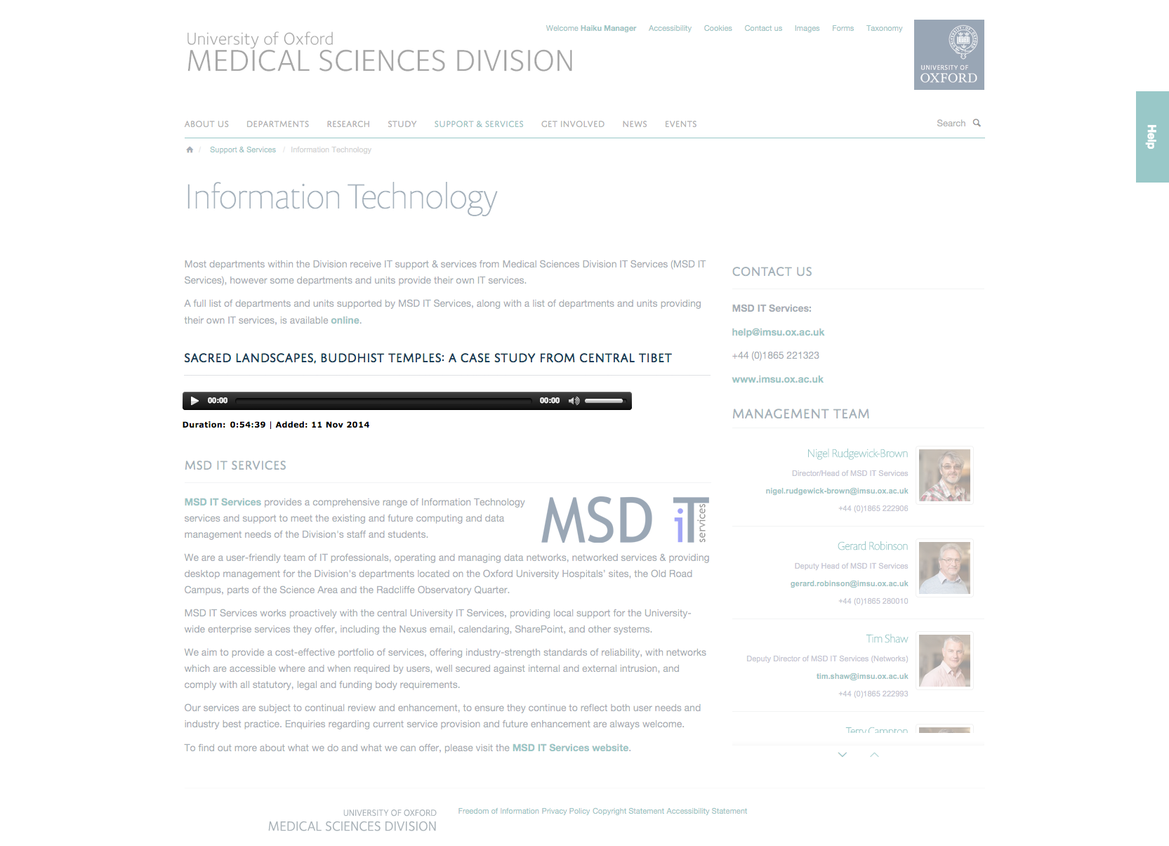 This feature will allow the embedding of oxPodcasts (podcasts.ox.ac.uk) on the Haiku websites. In order to allow for this, we will expand out the use of iFrames across the site, allowing them within additional content types such as news and events pages. The iFrames will be placeable anywhere on the page, and in addition we will the use of this functionality in the Rich Text portlet which will allow for further flexibility within your pages.