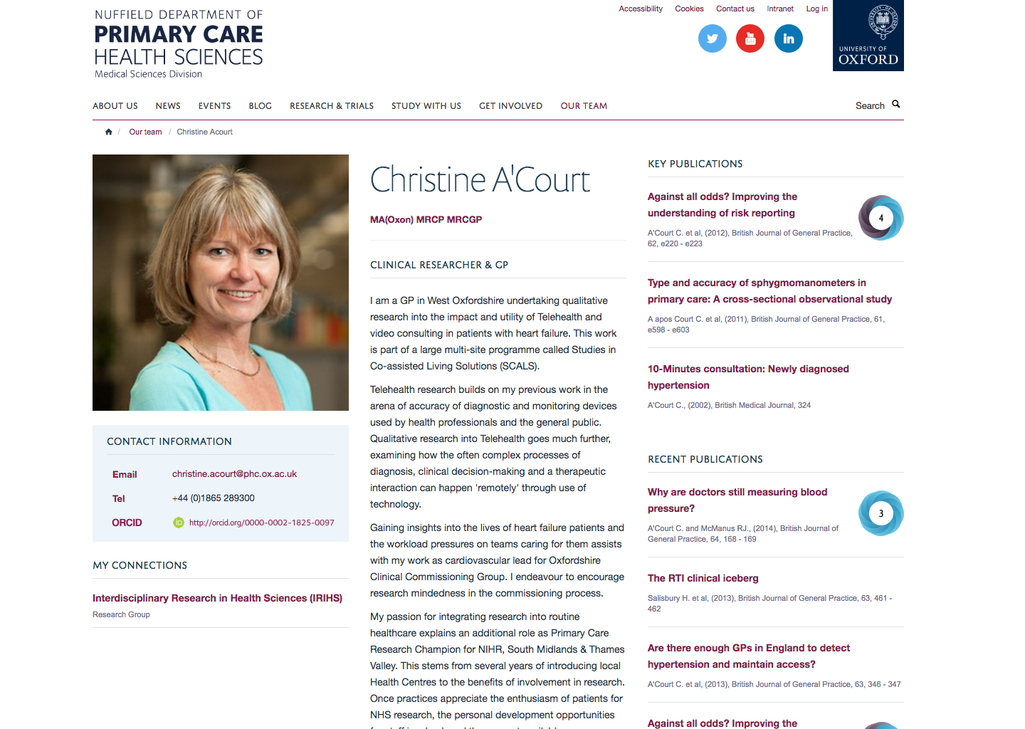 The University is encouraging researchers to take up an ORCID identifier at the moment. This is a unique identifier which means that each researcher can maintain a record of their academic career and outputs - http://orcid.org/ Researchers are encouraged to use their orcid identifier on their web page, along with a link to their ORCID record - http://orcid.org/trademark-and-id-display-guidelines It would be good to have a specific field for this on one of the researcher profile tiles along with the ORCID logo. I wonder if editors have a particular views about where it should go - with affiliations, or as an additional 'personal website' under contact details, or on the main personal details tile?